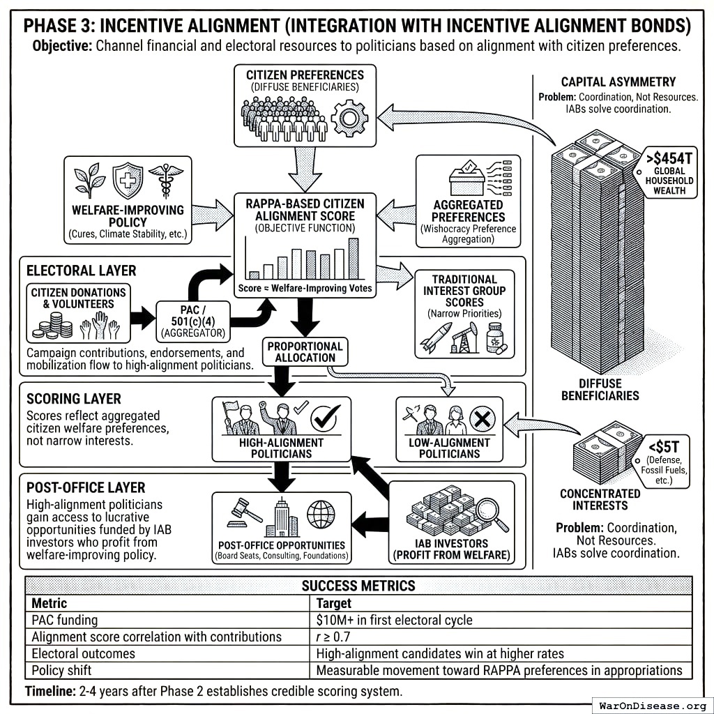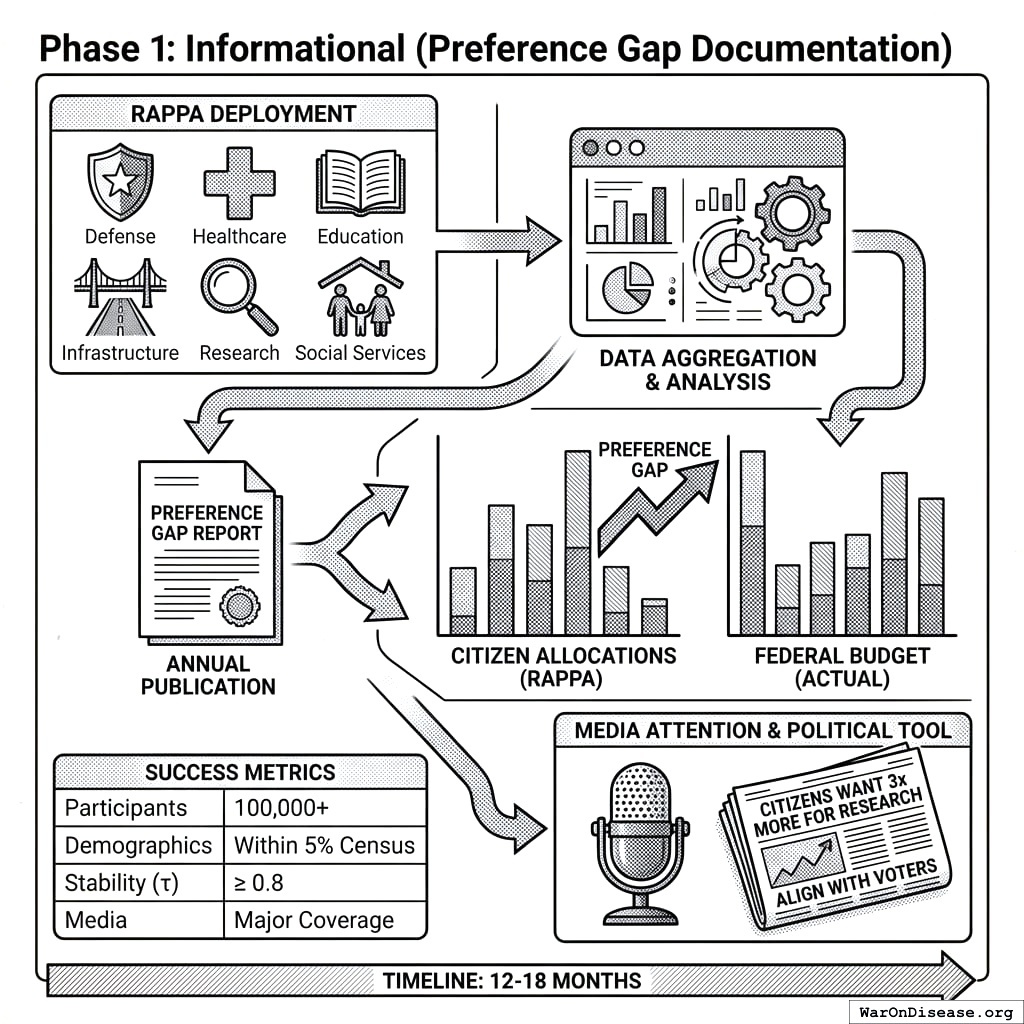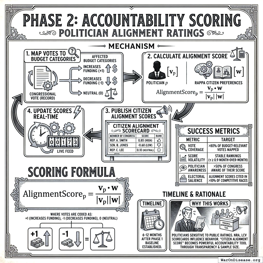 Accountability Integration: By producing clear, quantifiable preference signals that can be compared against politician voting records, RAPPA enables accountability mechanisms (Citizen Alignment Scores, Incentive Alignment Bonds) that align representative behavior with citizen welfare.