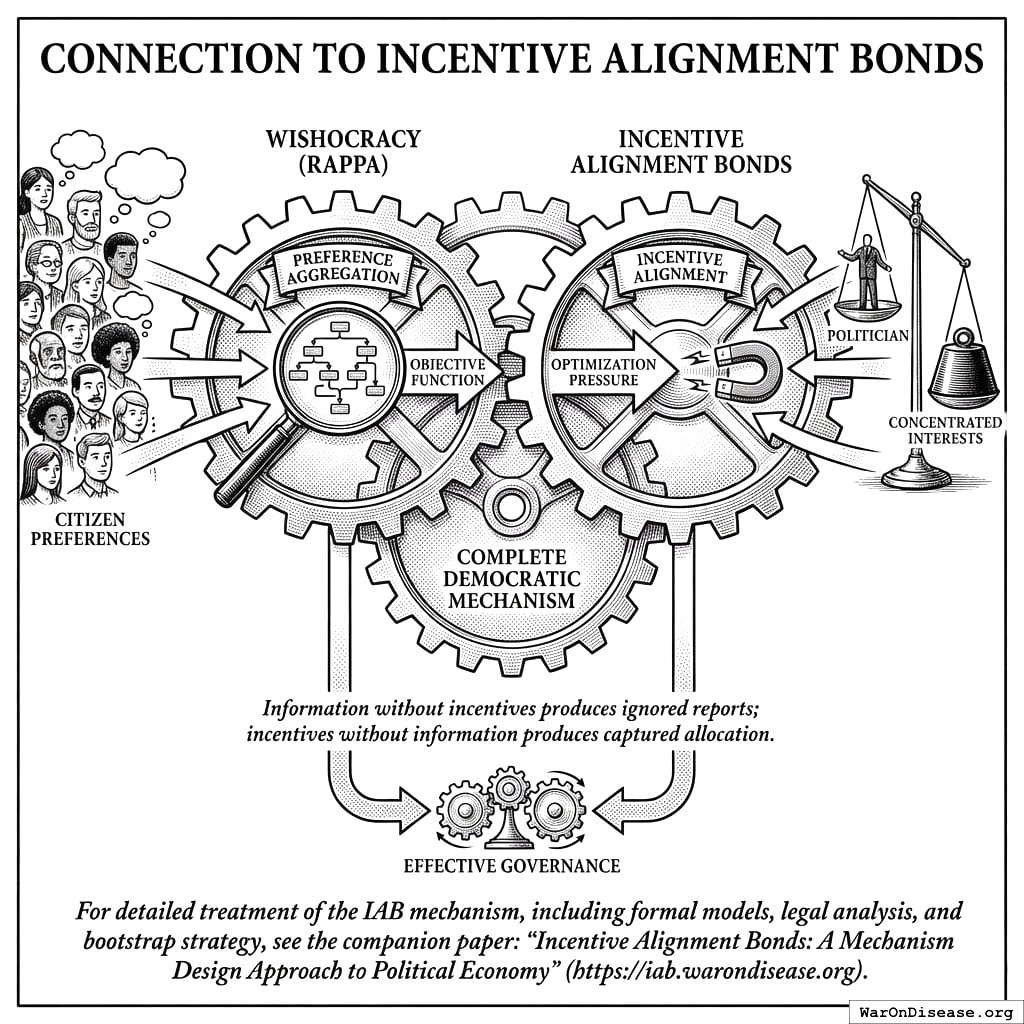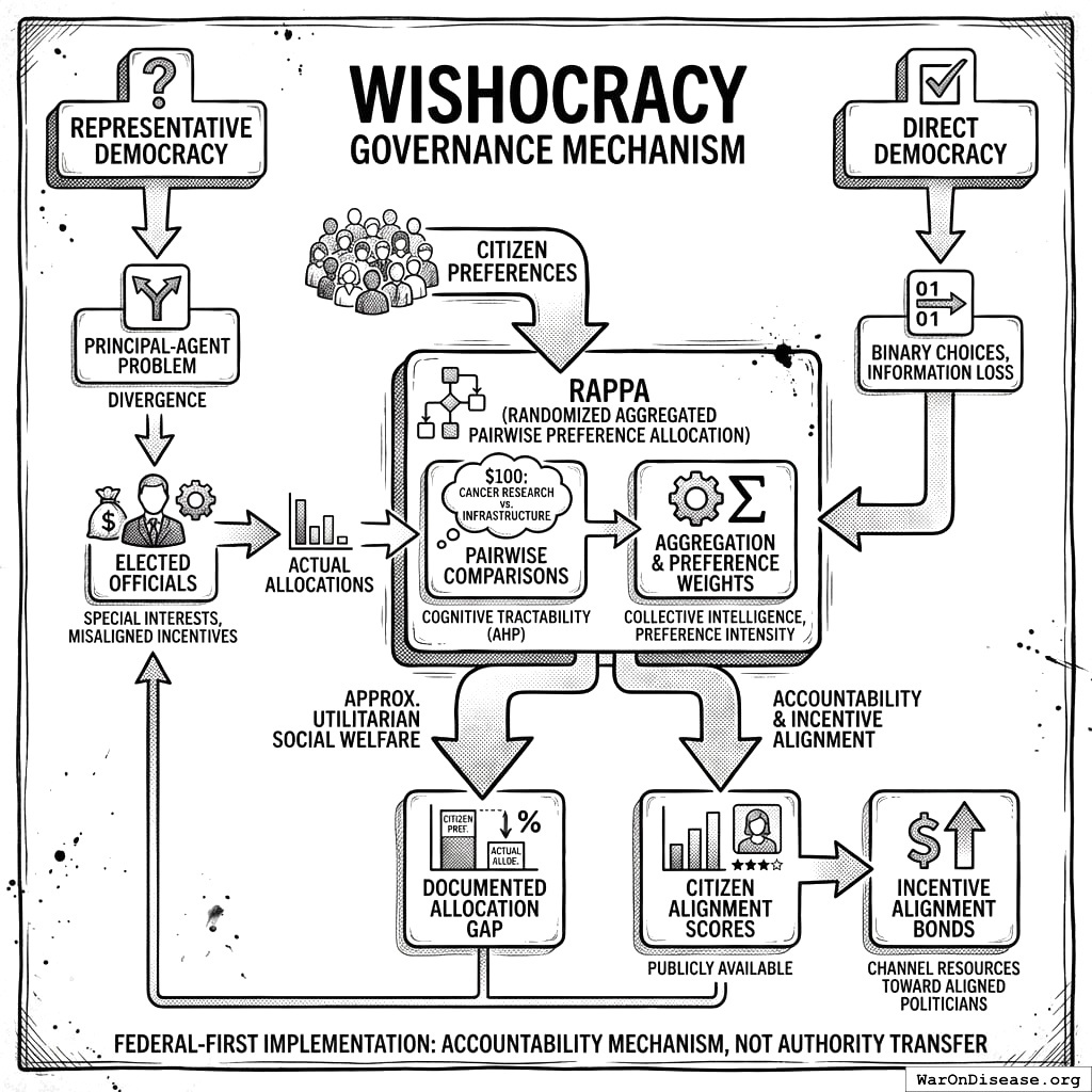 Representative democracy suffers from a fundamental principal-agent problem: elected officials systematically diverge from citizen preferences due to information asymmetry, special interest capture, and misaligned incentives. Meanwhile, direct democracy mechanisms reduce complex trade-offs to binary choices, losing crucial information about preference intensity. This paper introduces Wishocracy, a governance mechanism that addresses the democratic principal-agent problem by aggregating citizen preferences and creating accountability for elected representatives. The mechanism employs Randomized Aggregated Pairwise Preference Allocation (RAPPA), which presents participants with simple pairwise comparisons (‘allocate $100 between cancer research and infrastructure’) and aggregates millions of such judgments into preference weights that approximate utilitarian social welfare. Building on the Analytic Hierarchy Process133 for cognitive tractability and collective intelligence research134 for aggregation, RAPPA decomposes n-dimensional preference spaces into tractable binary choices while preserving preference intensity information. We present formal mechanism properties, computational complexity analysis, and empirical precedents from Porto Alegre’s participatory budgeting, Taiwan’s vTaiwan platform, and Stanford’s voting research. Rather than replacing representative democracy at the municipal level, we propose a federal-first implementation: (1) documenting the gap between citizen preferences and actual federal allocations, (2) creating public “Citizen Alignment Scores” for elected officials, and (3) integrating with Incentive Alignment Bonds to channel electoral and financial resources toward politicians whose voting records align with aggregated citizen preferences. This approach treats Wishocracy as an accountability mechanism that makes representative democracy work better, requiring no authority transfer, only information provision and incentive alignment.