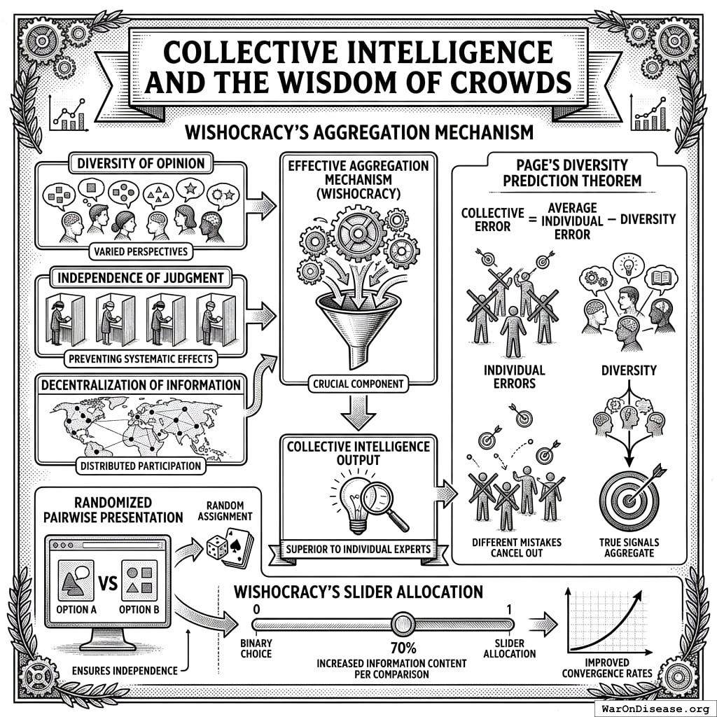 Page’s diversity prediction theorem formalizes this intuition: collective error equals average individual error minus diversity. A diverse crowd makes different mistakes that cancel out, while sharing enough common knowledge that true signals aggregate. Wishocracy’s slider allocation (rather than binary choice) increases the information content per comparison, improving convergence rates.