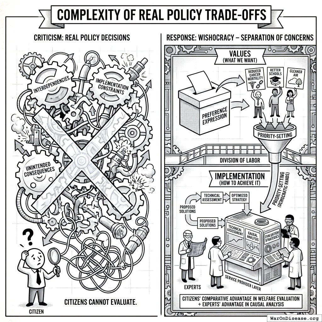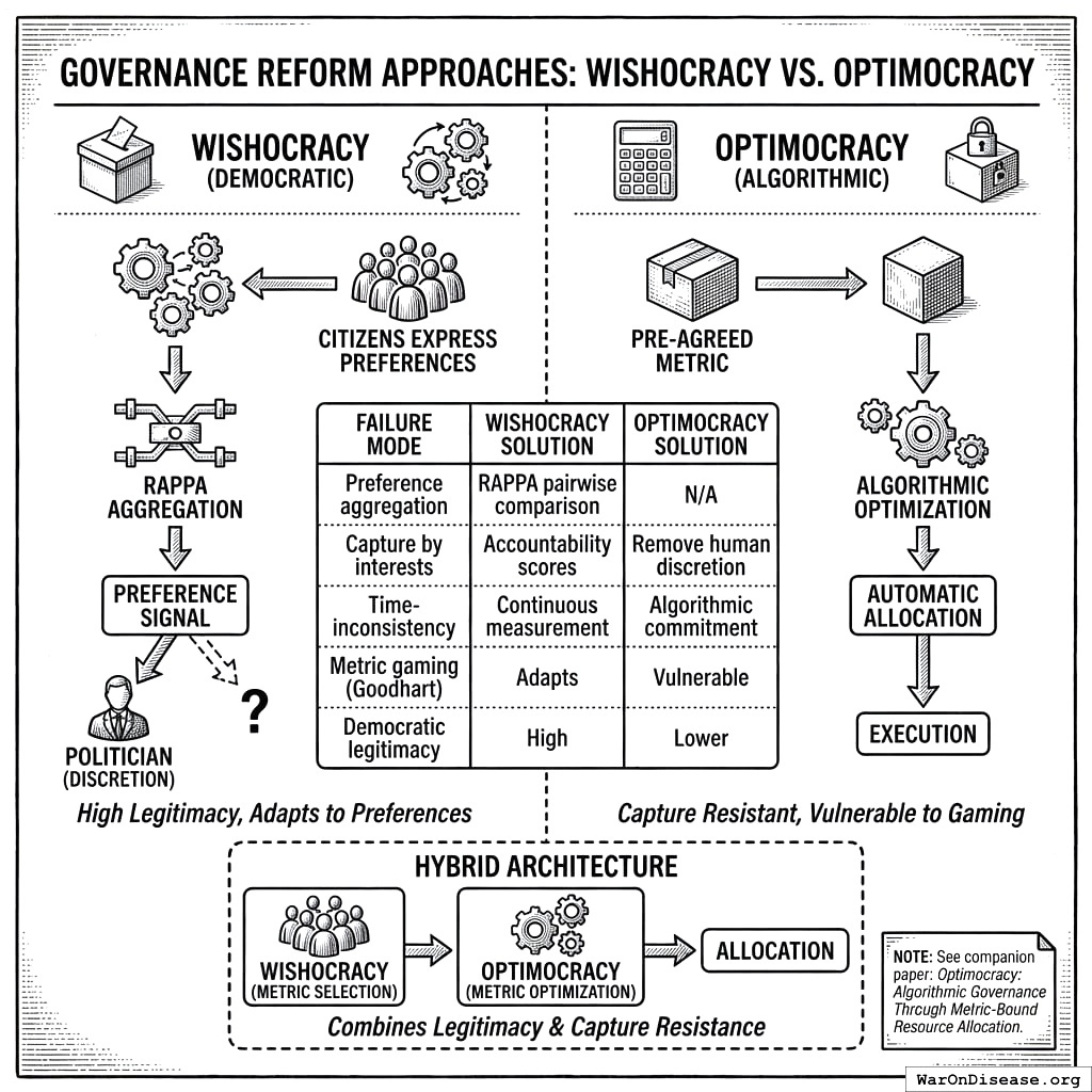 Wishocracy implies a separation of concerns: RAPPA determines what society values (the priority vector \(\mathbf{w}\)), while the implementation of those priorities is handled by a separate layer of competitive problem-solving organizations (see Appendix A: The Solution Layer). This distinction prevents the mechanism from bogging down in technical debates during the preference aggregation phase.