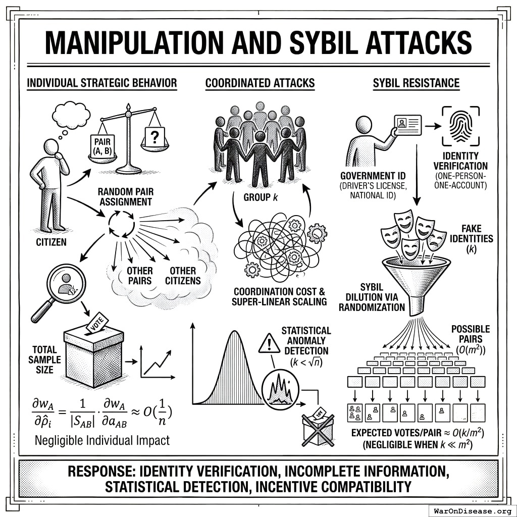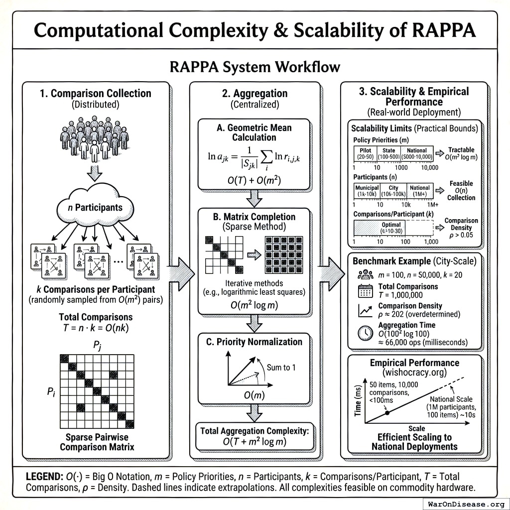 Empirical Performance: The reference implementation at wishocracy.org142 processes 10,000 comparisons across 50 items in under 100ms on standard cloud infrastructure (AWS t3.medium instance). Extrapolating linearly, national-scale deployment (1M participants, 100 items) would require ~10 seconds of aggregation time, negligible compared to voting/deliberation timescales measured in days or weeks.