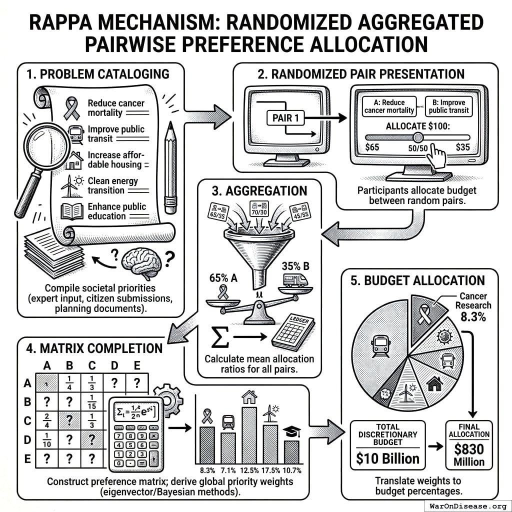 Futarchy: Proposed by economist Robin Hanson, futarchy uses prediction markets to aggregate information about which policies will best achieve agreed-upon goals. Under futarchy, “vote on values, bet on beliefs”: citizens determine welfare metrics democratically, then prediction markets determine which policies maximize those metrics. Futarchy excels at aggregating distributed information about causal mechanisms but assumes consensus on welfare metrics. RAPPA addresses the complementary problem: eliciting and aggregating preferences over competing welfare priorities when citizens disagree about relative importance (e.g., cancer research vs. education funding).