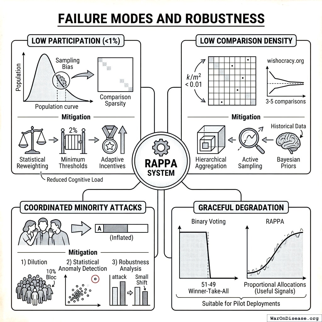 Comparative Advantages: RAPPA’s unique contribution lies in simultaneously addressing three constraints that limit alternative mechanisms: (1) Cognitive tractability through pairwise decomposition, (2) Preference intensity capture through slider-based allocation, and (3) Scalable aggregation through eigenvector methods that synthesize sparse distributed inputs. Where liquid democracy addresses who decides, futarchy addresses how to predict outcomes, and conviction voting addresses temporal aggregation, RAPPA addresses how to elicit preferences over complex multidimensional spaces.