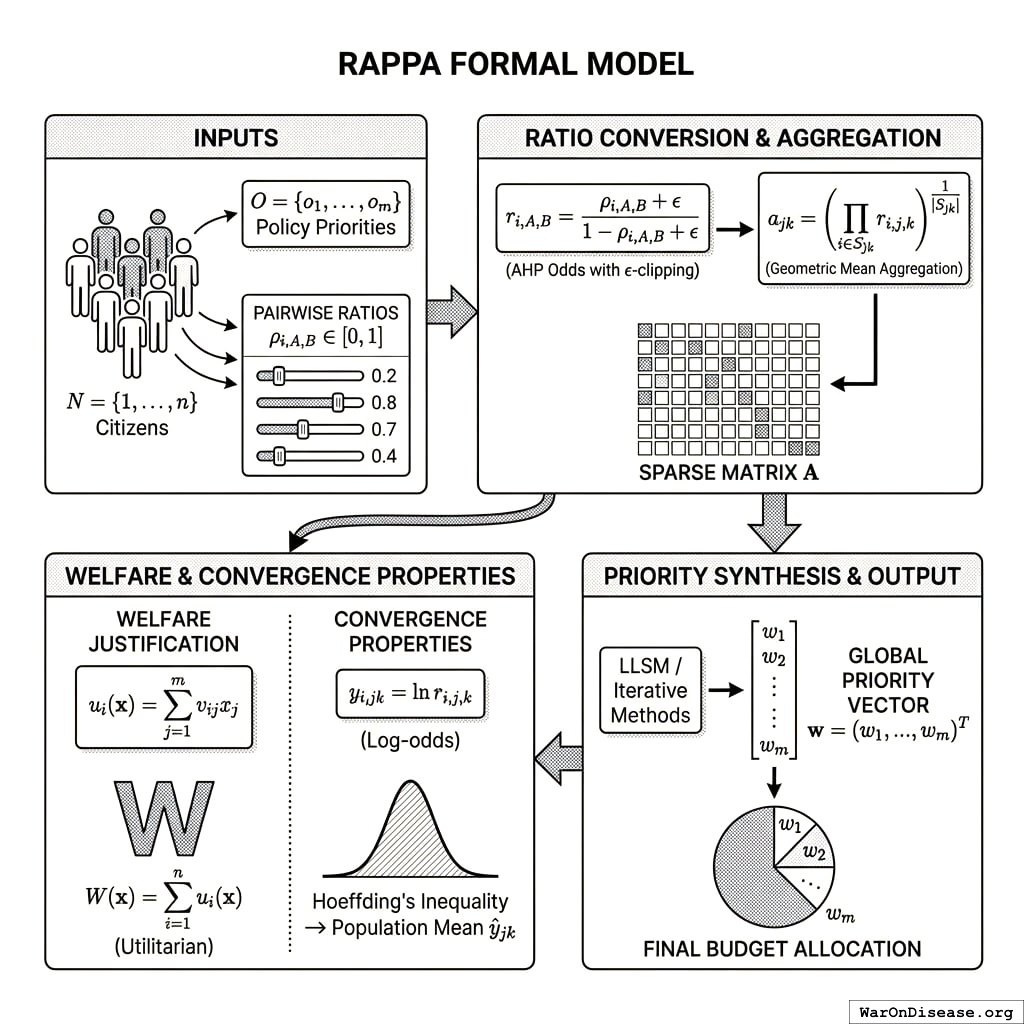 - Aggregation: Millions of other citizens make similar pairwise comparisons. Alice never sees “Medical Research vs. Drug Enforcement,” but the system infers the relationship (Medical Research > Military > Drug Enforcement) through the transitive network of all citizens’ choices.