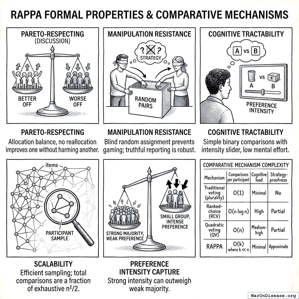 RAPPA’s pairwise slider allocation captures preference intensity naturally. When a participant allocates 90% to cancer research and 10% to Alzheimer’s research, they express strong preference intensity. A 55-45 split signals near-indifference. This information emerges from intuitive trade-off judgments rather than strategic budget management. Aggregated across the population, these intensity signals produce allocations that weight both the number of supporters and the strength of their preferences, achieving the welfare benefits of intensity-weighted voting without the cognitive overhead.