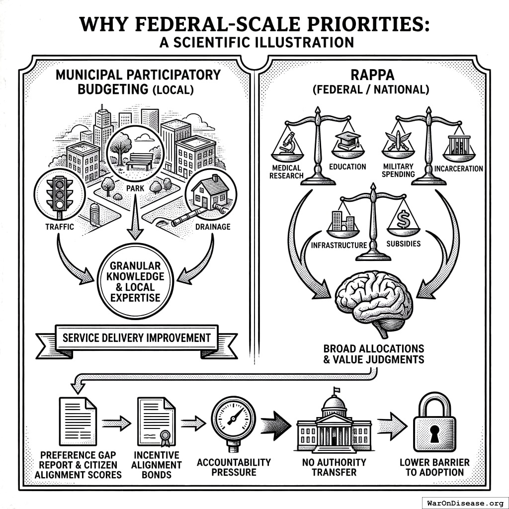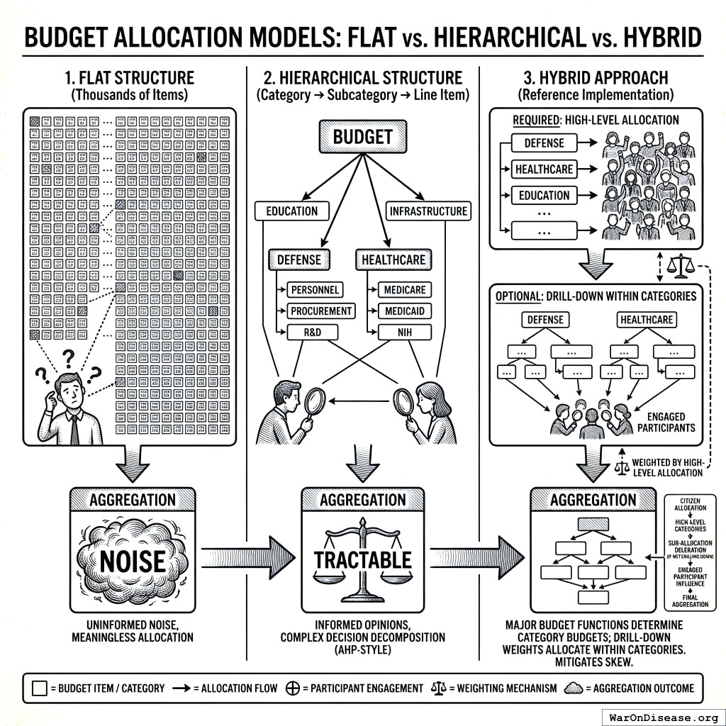 Participatory Budgeting: Traditional participatory budgeting (as pioneered in Porto Alegre138 and discussed in Section 4.1) involves citizen assemblies deliberating on budget proposals, followed by voting139. While highly democratic, this approach faces scalability limits: participation rates typically remain under 5%, and cognitive load increases exponentially with the number of budget items140. RAPPA retains participatory budgeting’s democratic legitimacy while achieving scalability through decomposition and statistical aggregation.