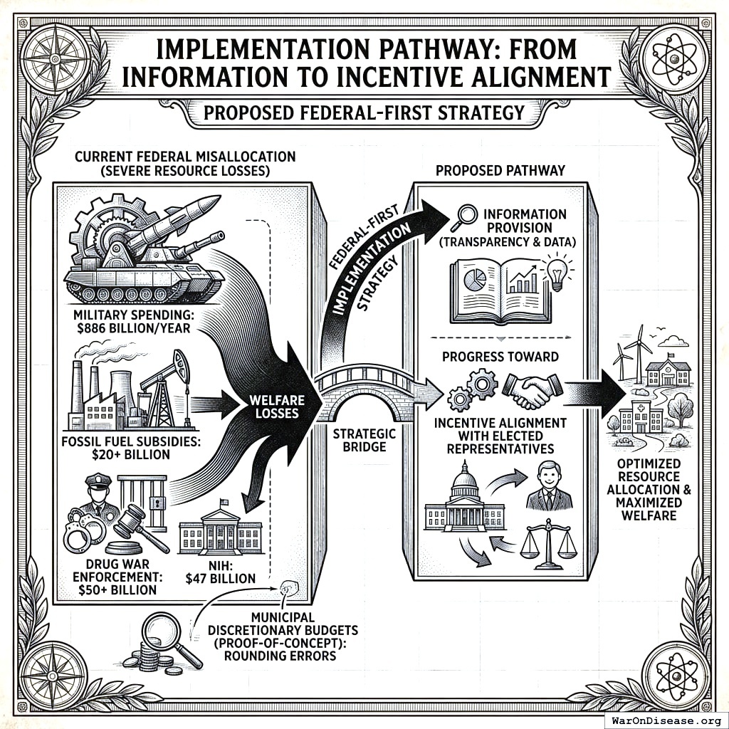 Policy priorities (\(m\)): Pilot deployments (municipal budgets): \(m = 20-50\) items. State/national budgets: \(m = 100-500\) items. Full government budget line items: \(m = 5,000-10,000\) items. The \(O(m^2 \log m)\) aggregation complexity remains tractable even at \(m=10,000\) (requiring ~10^9 operations, feasible on commodity hardware in seconds).