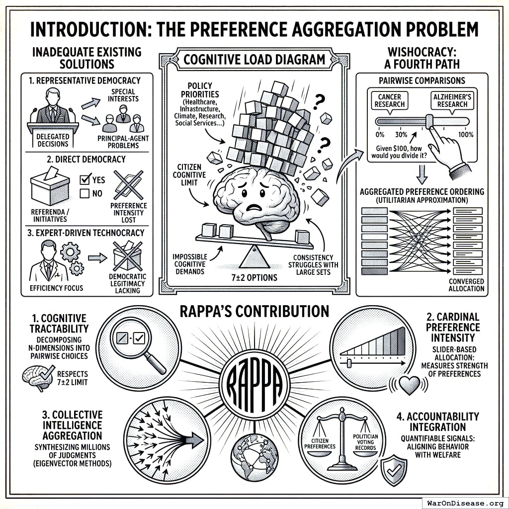 Wishocracy offers a fourth path: a mechanism that harnesses collective intelligence through structured preference elicitation while respecting cognitive constraints, incorporating preference intensity, and maintaining democratic legitimacy. By presenting citizens with simple pairwise comparisons (‘Given $100 to allocate between cancer research and Alzheimer’s research, how would you divide it?’), the mechanism decomposes the impossible n-dimensional comparison into tractable binary choices. Aggregated across millions of such comparisons from thousands of participants, the system converges on a preference ordering that approximates the utilitarian social welfare function under stated assumptions.