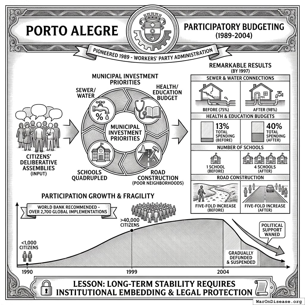 However, Porto Alegre also illustrates the fragility of participatory mechanisms. When political support waned after 2004, PB was gradually defunded and eventually suspended. This underscores the importance of institutional embedding and legal protection for any participatory mechanism seeking long-term stability.