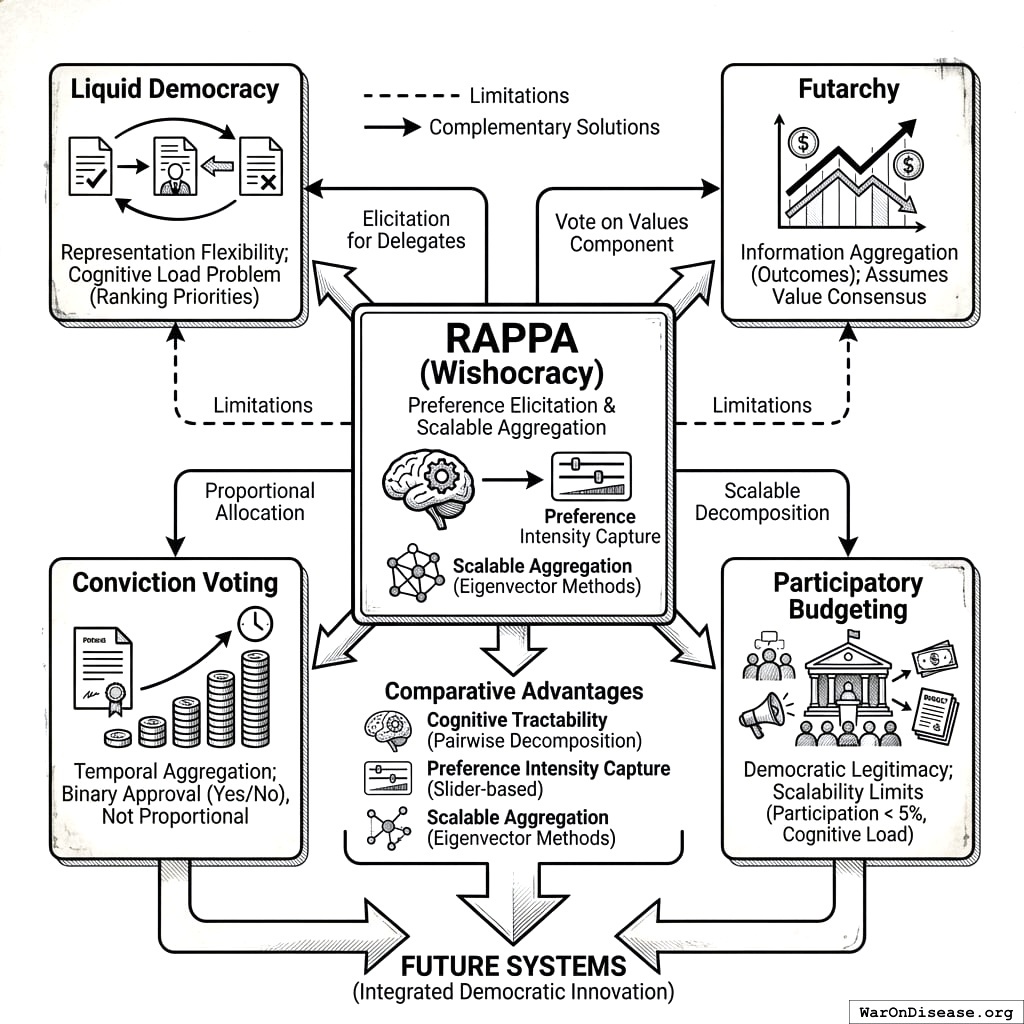 RAPPA exists within a broader landscape of democratic innovation and participatory governance mechanisms. We position Wishocracy relative to four major alternative approaches: