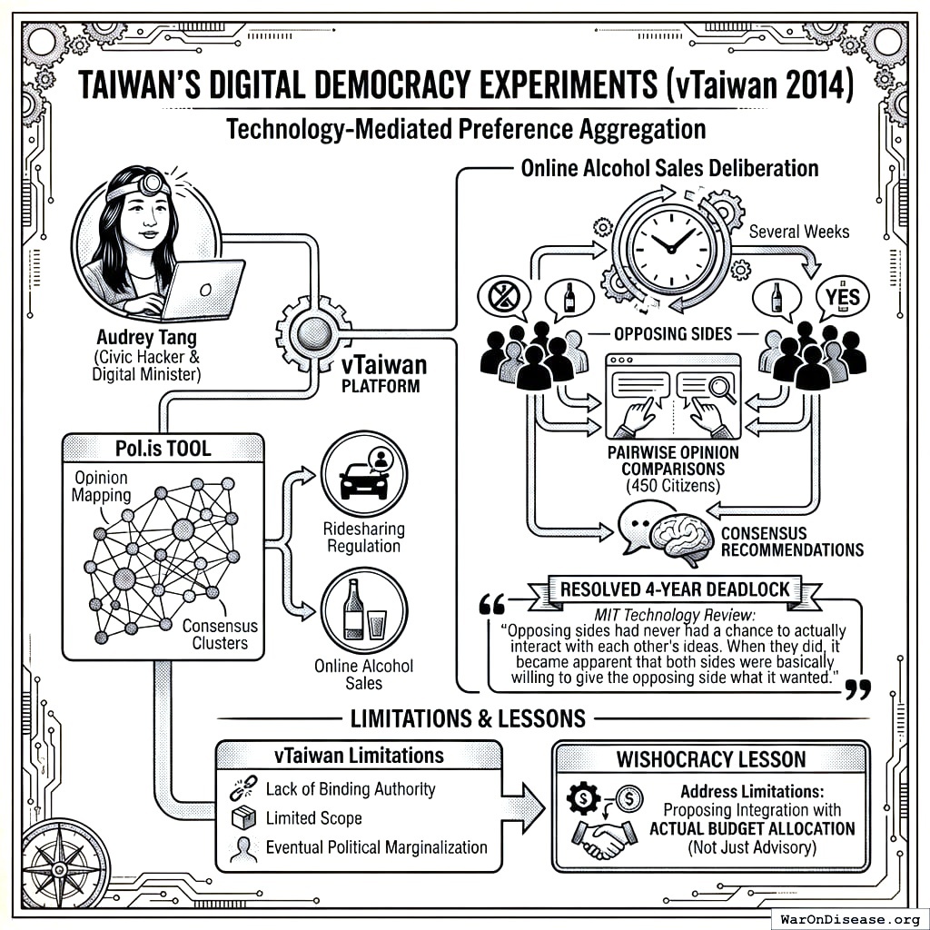 Taiwan’s vTaiwan platform, launched in 2014 by civic hacker Audrey Tang (later Taiwan’s Digital Minister), demonstrates the potential of technology-mediated preference aggregation. The platform used Pol.is, a tool that maps opinions and identifies consensus clusters, to deliberate on contentious policy issues including ridesharing regulation and online alcohol sales.