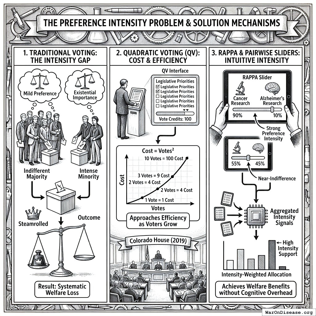 A fundamental limitation of traditional voting is the failure to account for preference intensity. Under one-person-one-vote, a citizen who mildly prefers policy A has equal influence to one for whom policy A is existentially important. This leads to systematic welfare losses: intense minorities can be steamrolled by indifferent majorities, and the resulting allocations fail to maximize aggregate welfare.